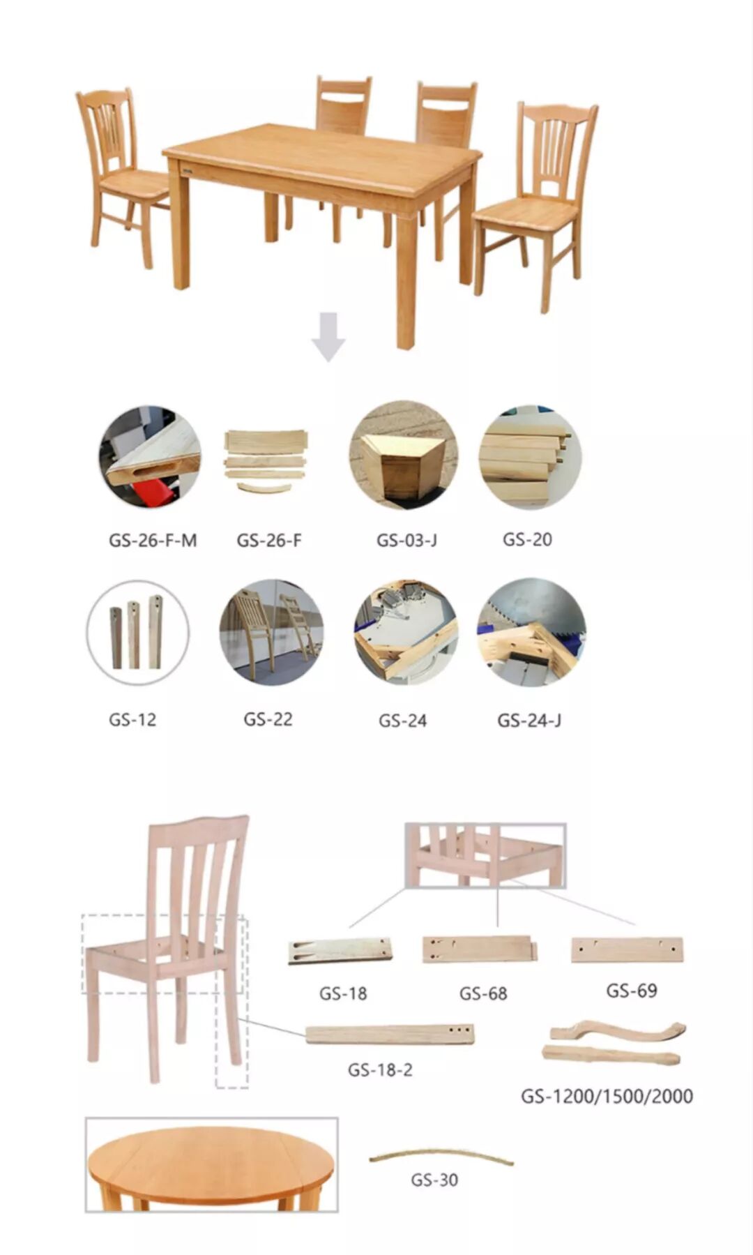 本文介绍的餐桌椅解决方案为餐桌椅脚(前脚和后脚)、座框、座框角的三角木、餐椅侧板、餐椅背板、餐桌围边等部位所需的做榫、钻孔/攻牙、铣槽/钻孔,做榫/钻孔,钻孔/锯切,椅脚成型(餐桌椅多功能)、靠模仿型的需求,提供众多机械设备的选择,多为数控型,带自动上卸料、调机方便,效率高。